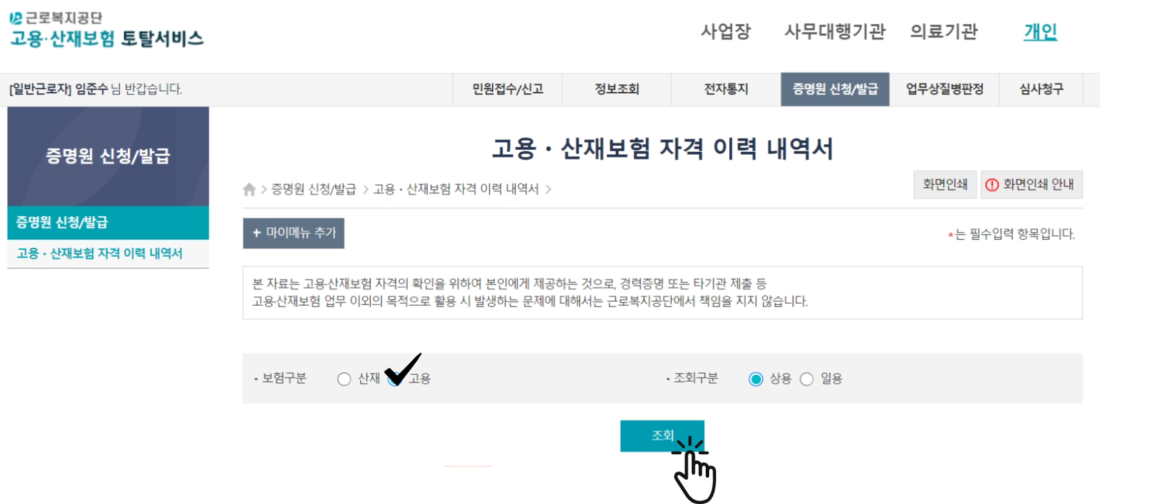 3. "고용"에 마우스로 체크하고 "조회"를 클릭