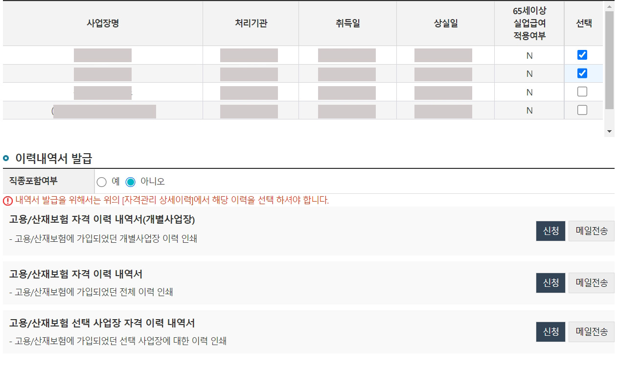 2. "고용/산재보험 자격 이력 내역서" 클릭