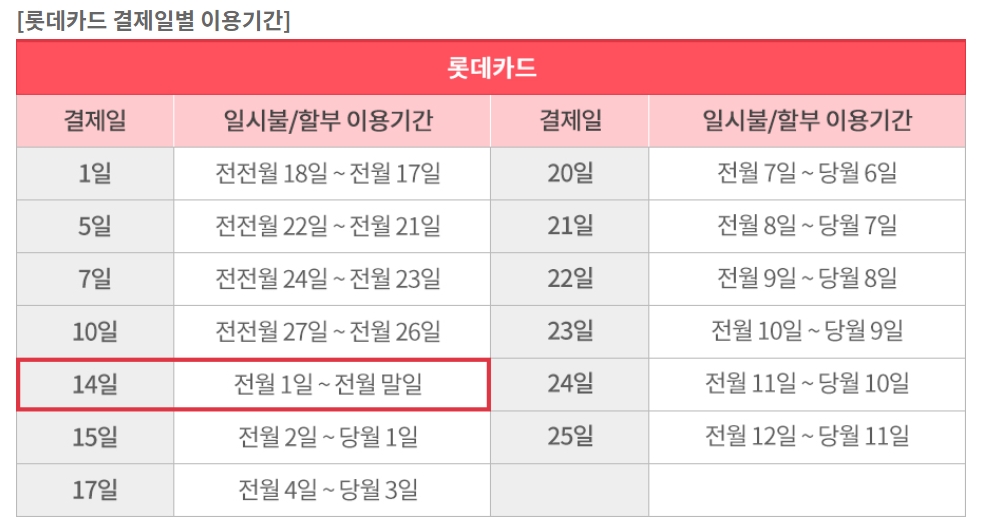 결제일 설정이 별거 아닐 수 있지만 14일로 설정할 경우 매월 소비 금액을 확인하기 쉽고, 신용카드 혜택을 위한 전월 실적 조건을 계산하기 편합니다.