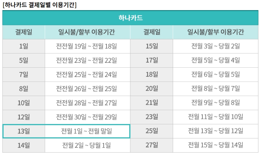 카드사마다 다르지만 매달 13~15일로 결제일을 설정해야 이전 달의 1일 ~ 말일까지의 지출한 금액이 결제됩니다.