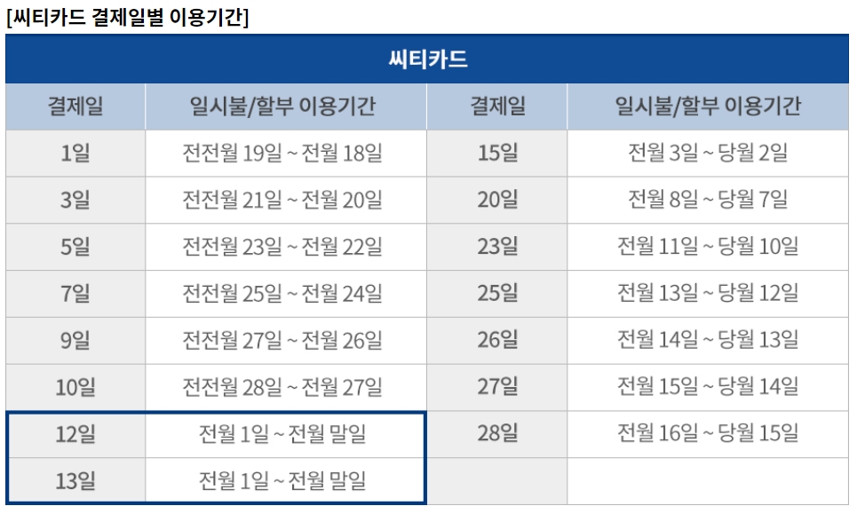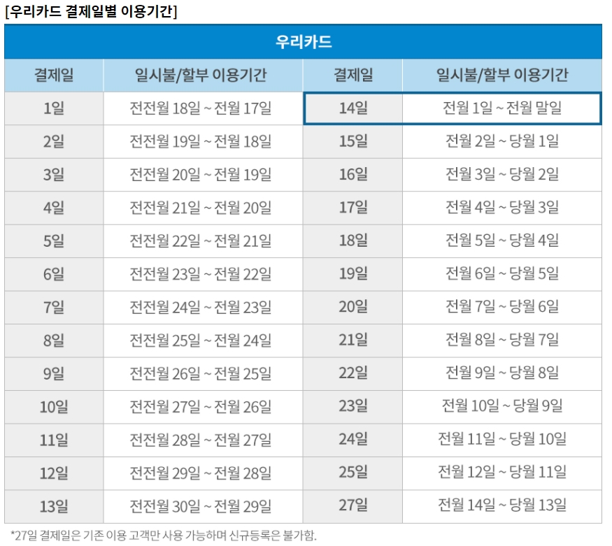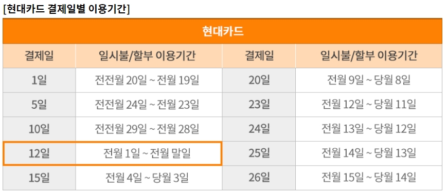 - 결제일별 이용기간은 영업일 또는 카드사의 사정으로 1~2일(영업일 기준) 변동될 수 있습니다.