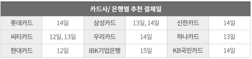 각 카드사별 결제일을 본다면 삼성, 신한, 현대카드 그 외 카드사의 12~14일 결제일이 전월 1일 ~말일까지의 이용 대금을 결제할 수 있습니다.