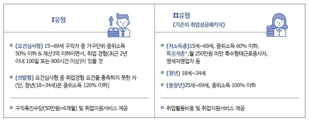 - 저소득 구직자 등 Ⅰ유형 대상에게 구직촉진수당(50만 원 × 6개월) 을지 급하여 저소득층 생계안정 지원