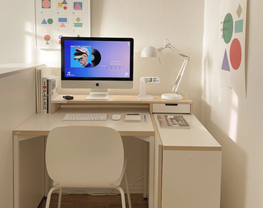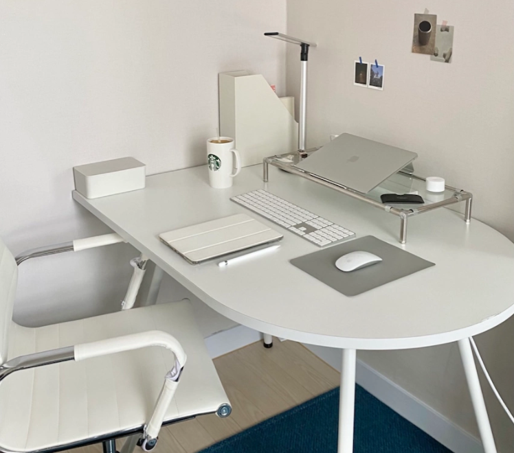 심플한 흰색으로 통일한 책상 공간은 보기에도 깔끔하며 작업 시 집중력이 깨지지 않습니다.