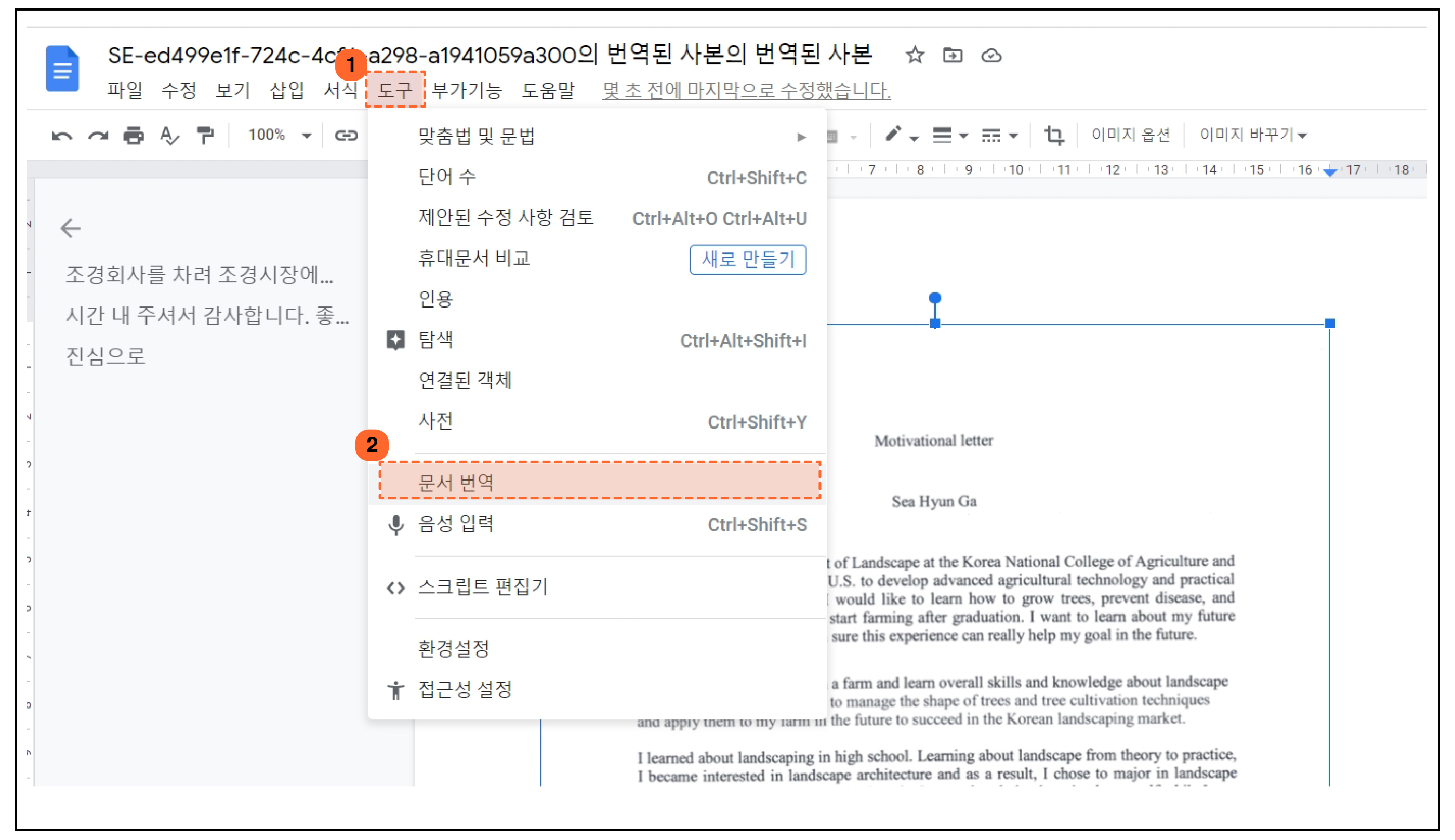 1. 위와 올일한 방법으로 이미지 파일을 불러옵니다. → 도구에서 문서 번역을 클릭합니다.