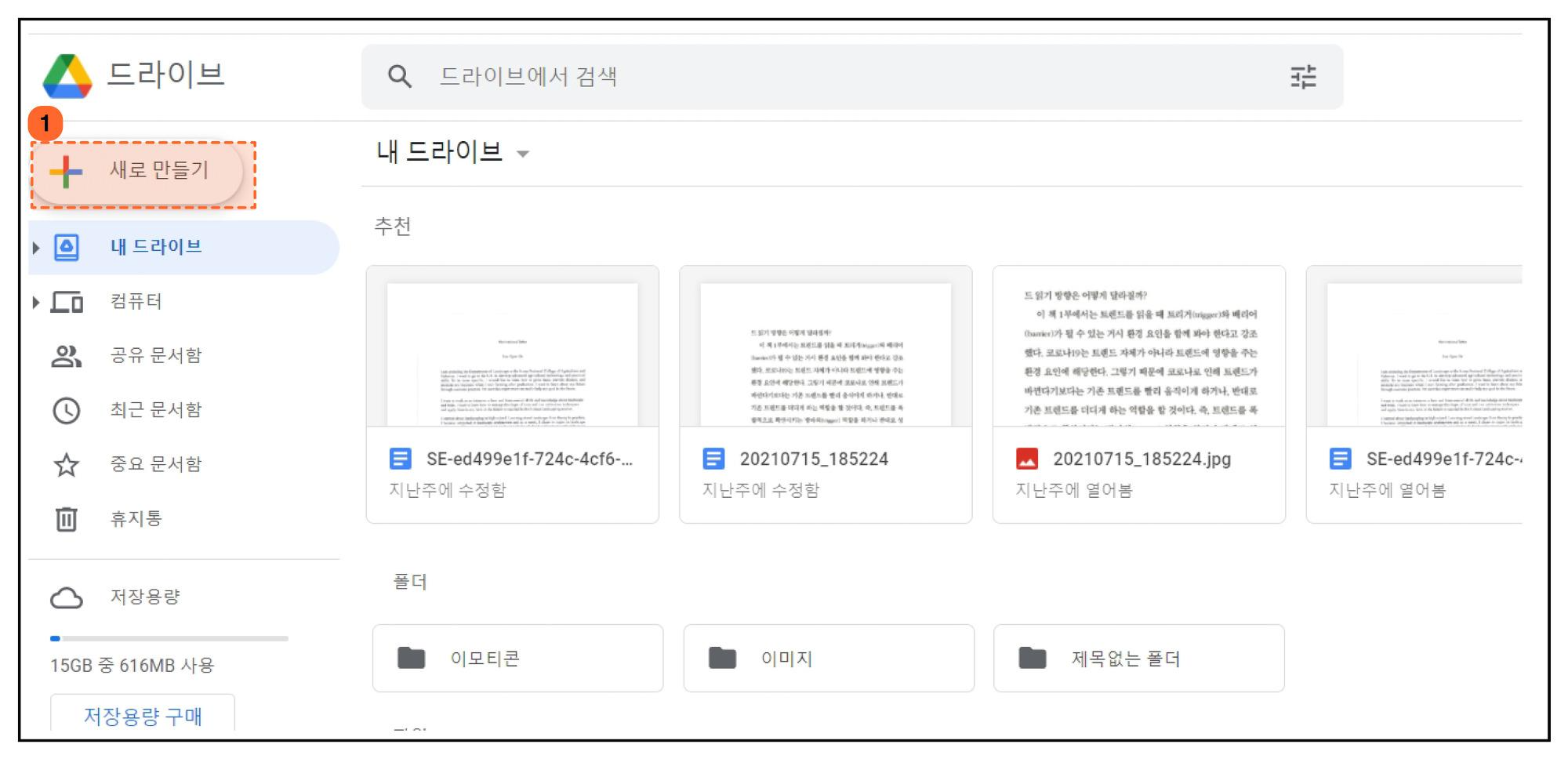 2. 구글 드라이브에 접속했다면 → 새로 만들기를 눌러 줍니다.