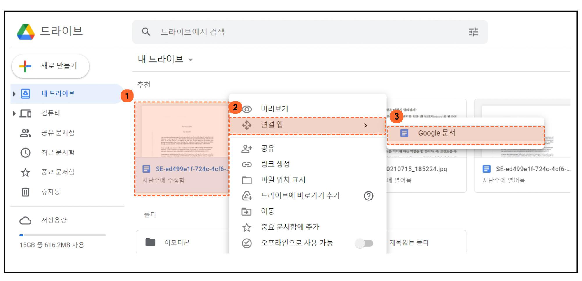 4. 업로드된 파일 위나. 파일명에 마우스 놓고 마우스 오른쪽 클릭 → 연결 앱 클릭 → 구글 문서 클릭 합니다.