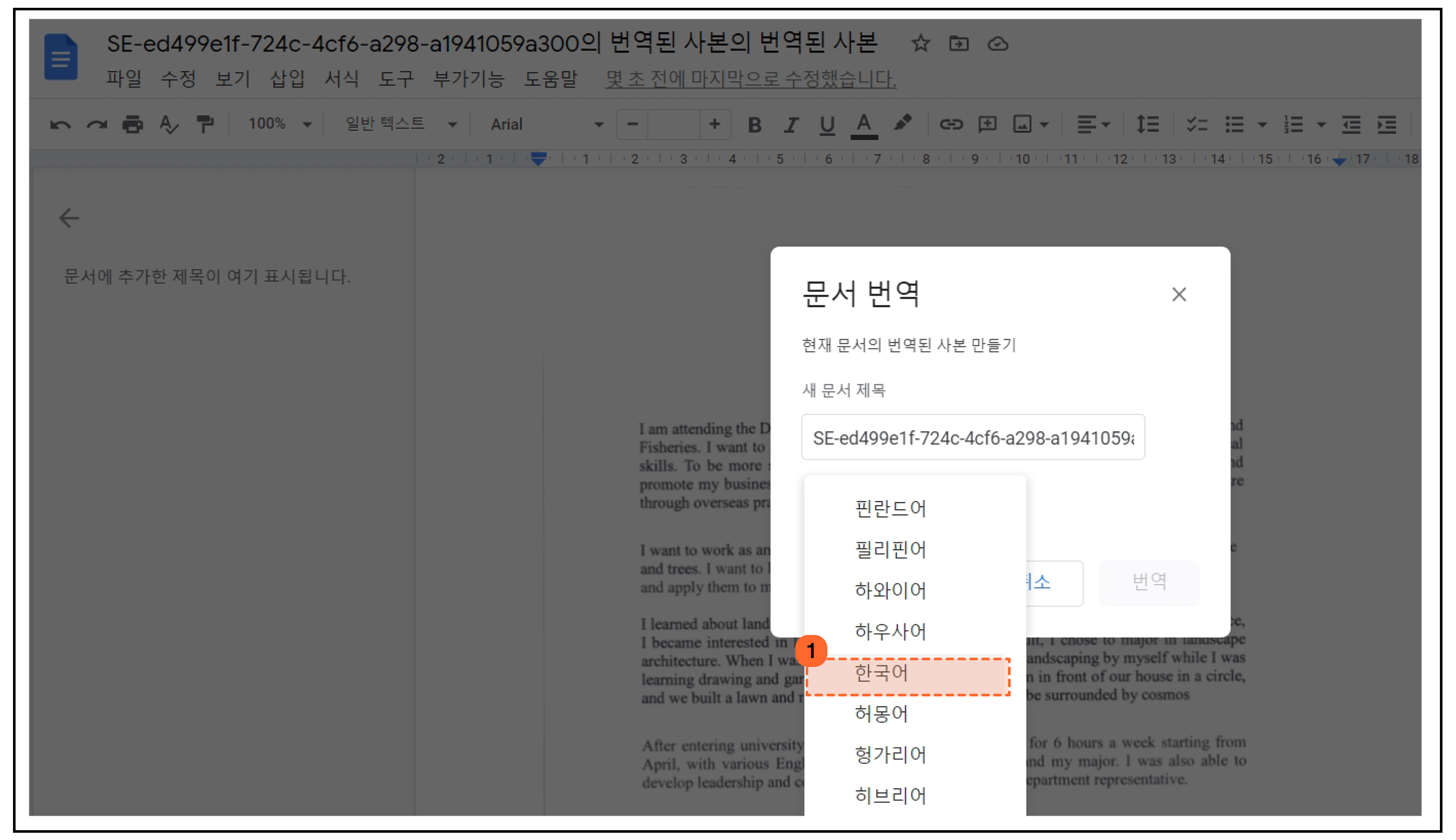 2. 번역을 원하는 언어를 선택! 번역을 클릭!