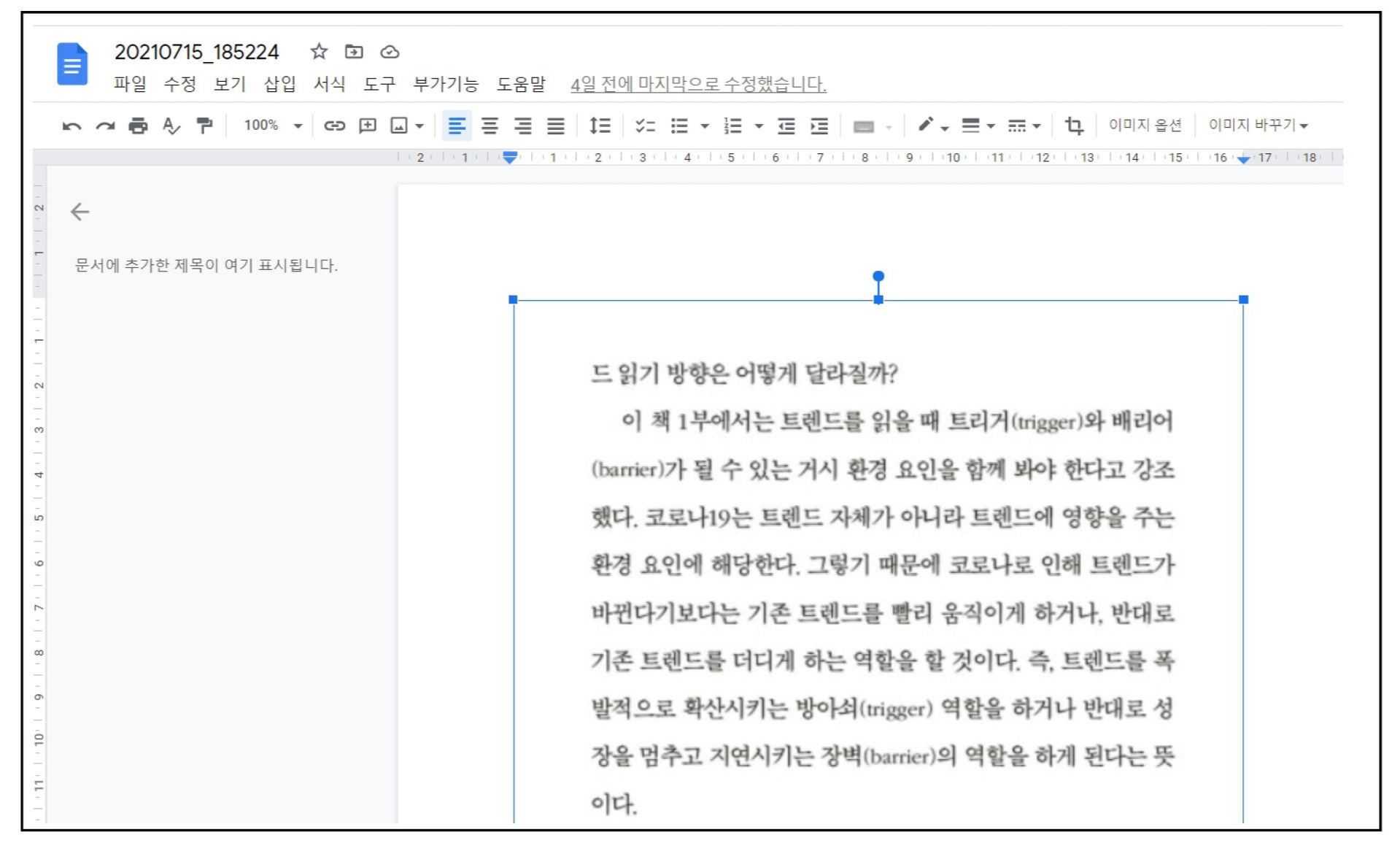 6. 문서 창이 열리면서 사진과 같이 위에 업로드한 이미지와 아래에 변환된 텍스트가 나옵니다.