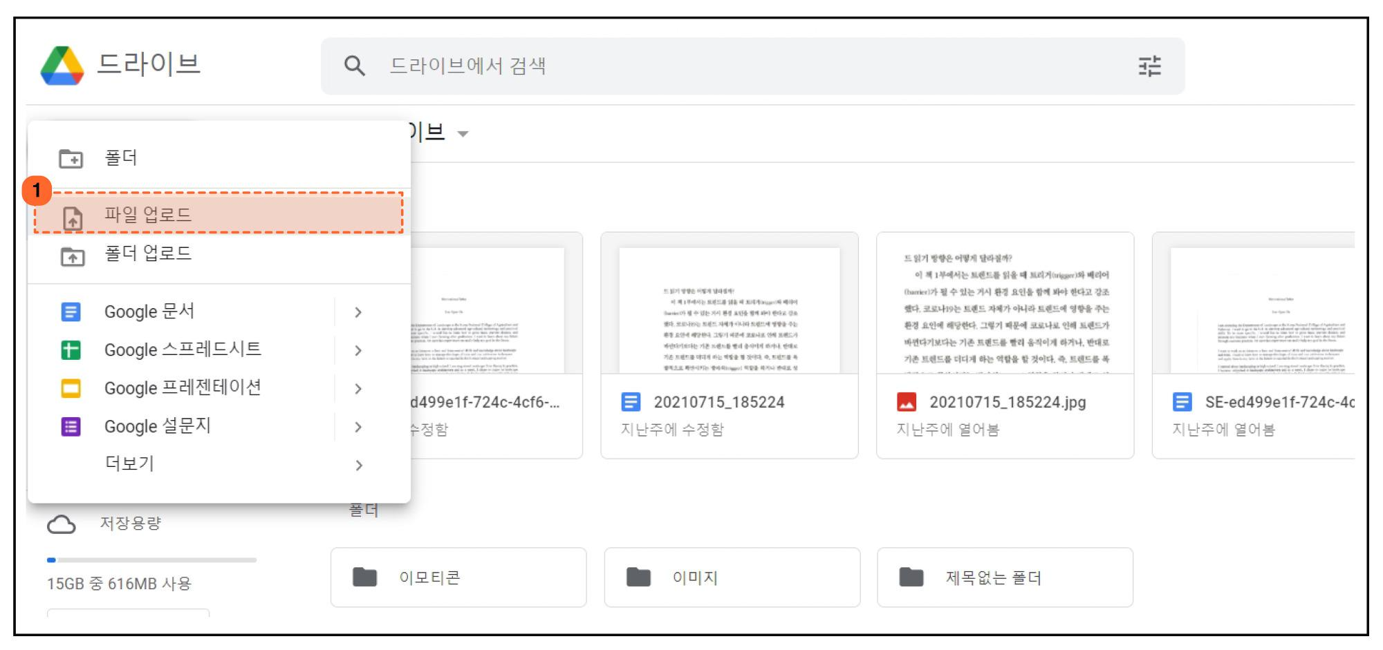 3. 새로 만들기를 클릭하면 아래와 같이 파일업로드 / 폴터 업로드가 나옵니다.