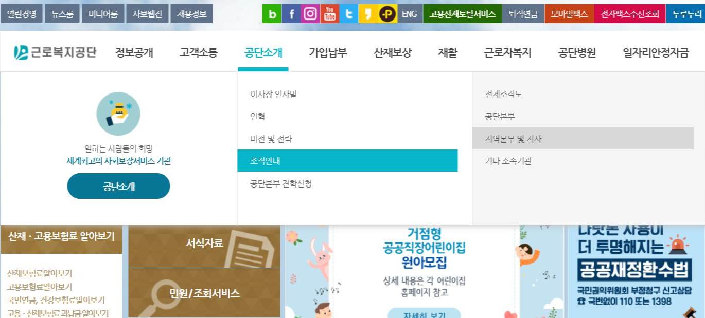 공단 소개 → 조직안내 → 지역본부 및 지사