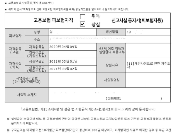 실업 급여를 신청하기 위해 근로복지공단 고용·산재보험 토털 서비스 사이트에서 확인해 봤는데 개인 사정으로 인한 자진퇴사 처리로 되었더라고요.
